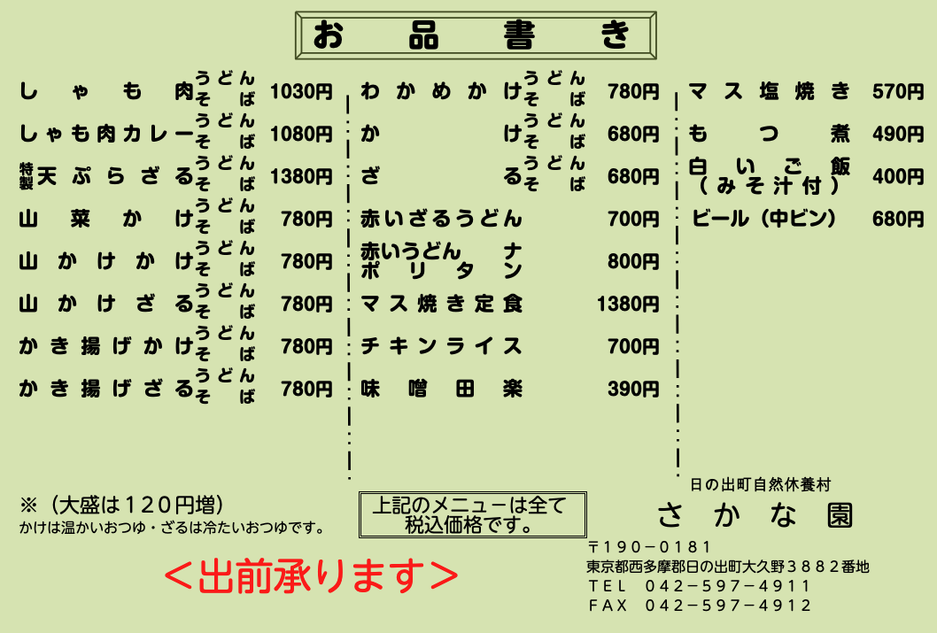 金額はすべて税込になります。お支払いは現金のみになります。